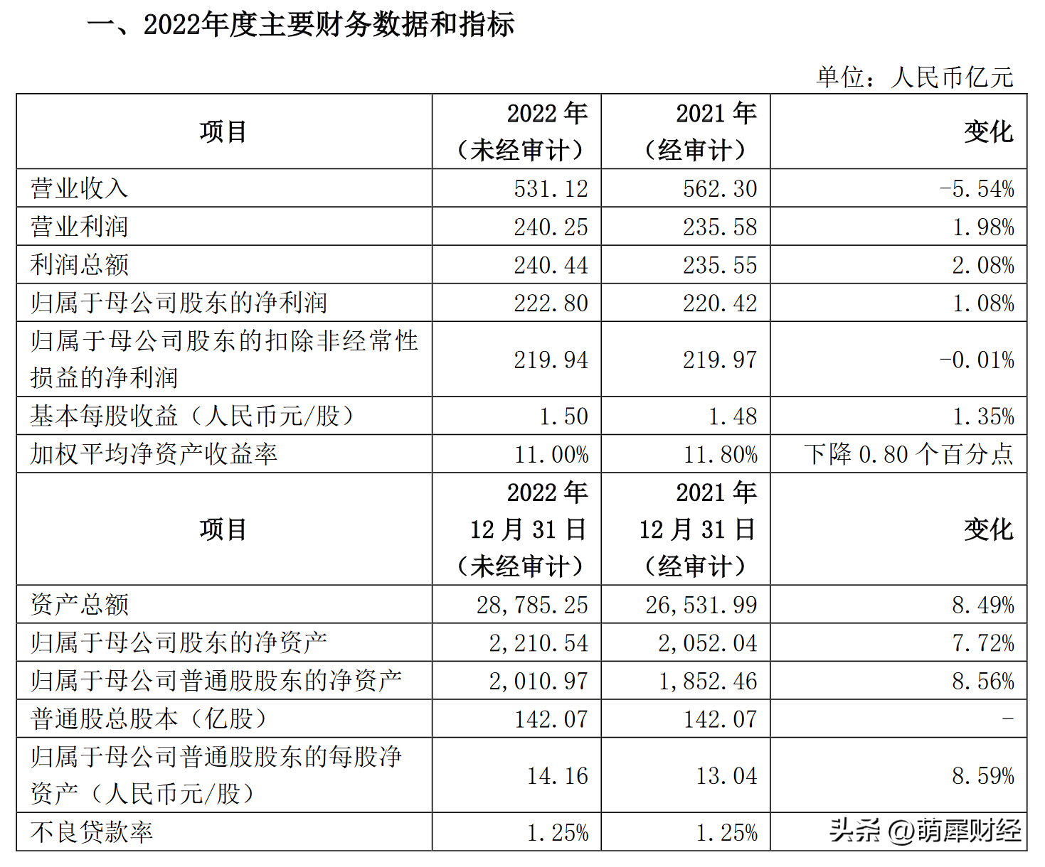经营情况方面,2022年度,上海银行实现营业收入531.12亿元,同比下降5.54%;实现净利润222.80亿元,同比上涨1.08%;实现扣非净利润219.94亿元,同比下降0.01%;基本每股收益为1.50元/股,同比上涨1.35%;加权平均净资产收益率为11%,同比下降0.80个百分点。