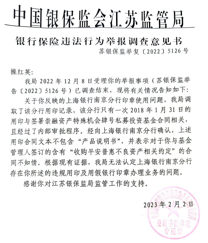 2022年9月30日和2023年2月2日,该局给予回应:“我局调取了该分行用印记录,该分行只有一次2018年1月31日的用印与签署崇融资产特殊机会肆号私募投资基金合同相关。经向上海银行南京分行确认,上述用印合同文本不包含《产品说明书》,并表示对于举报人与基金管理人签订的含有收购平安普惠不良资产相关约定的合同不知情。”