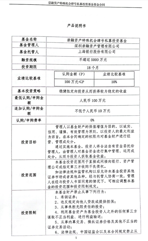 2018年6月,曹女士斥资200万购买了《崇融资产特殊机会肆号私募投资基金》,并与基金管理人深圳崇融资产管理有限公司、托管行上海银行南京分行签订三方合同,该产品期限为18个月。