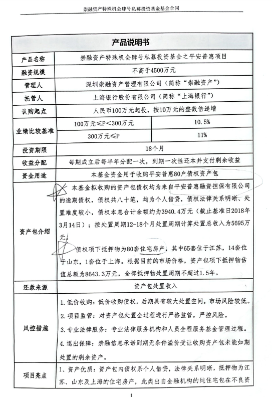 第一个区别是前两页的《产品说明书》不同。曹女士手上那份的产品名字叫“崇融资产特殊机会肆号私募投资基金之平安普惠项目”,募集资金用于收购平安普惠80户债权资产包,款项直接付平安普惠公司,还款来源是资产包的处置收入,还称债权资产包“法律关系明晰,处置空间较大,市场风险较低”。