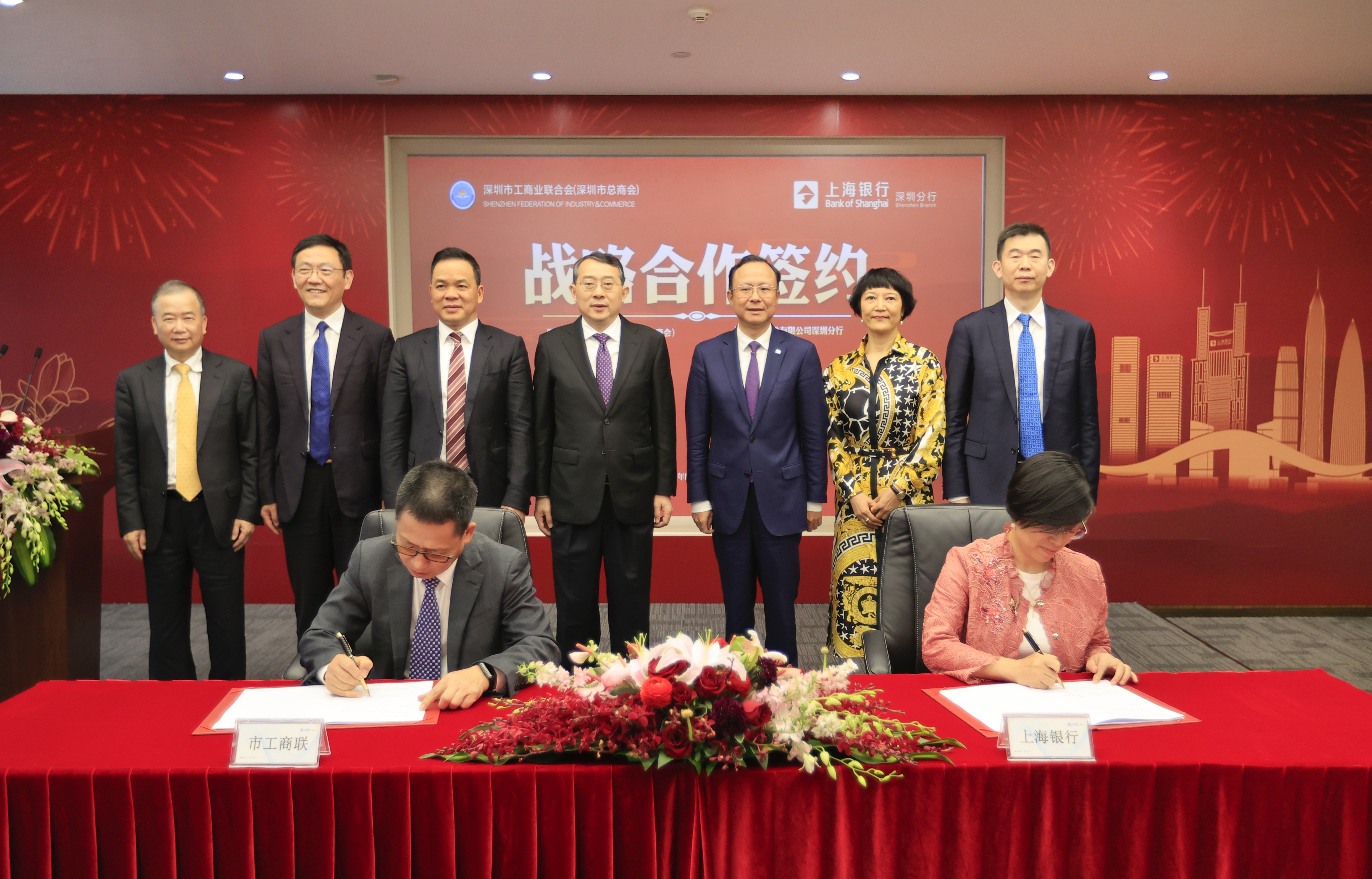 近日,上海银行与深圳市工商联(总商会)举行战略合作协议签约仪式。深圳市工商联(总商会)主席、会长张春华,深圳市工商联党组书记李勇,上海银行行长朱健、董事会秘书李晓红、业务总监朱守元等出席并共同见证双方签约。