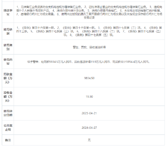 因存在上述多项违法行为,上海银行被外管局警告,并罚款9834.5万元人民币,没收违法所得19.9万元人民币,罚没款合计9854.4万元人民币。