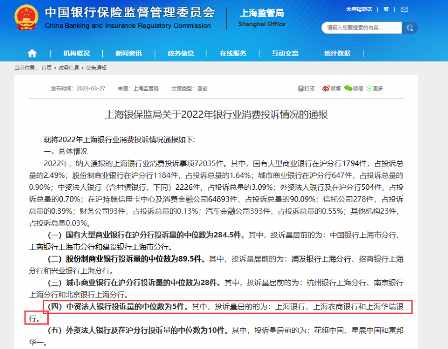 上月,上海银保监局公布2022年银行业消费投诉情况的通报,当年纳入上海银行业消费投诉事项共72032件。其中,上海银行投诉量为885件,每百营业网点投诉量379.8件,每千万个人客户投诉量551.2件,投诉量在中资法人银行中排名居前。