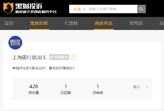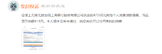 黑猫投诉【投诉入口】平台的数据显示,上海银行累计投诉428单,无一回复处理。不少用户表示征信上莫名出现上海银行股份有限公司发放的个人消费贷款信息,但本人实际并未进行任何申请。
