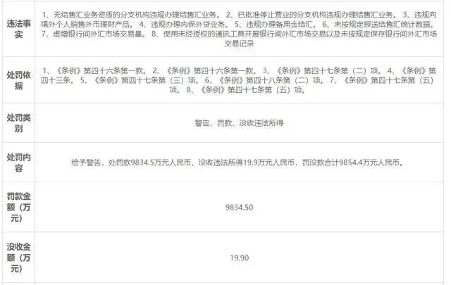 对此,国家外汇管理局上海市分局对该行给予警告,并处罚款9834.5万元人民币,没收违法所得19.9万元人民币,罚没款合计9854.4万元人民币。