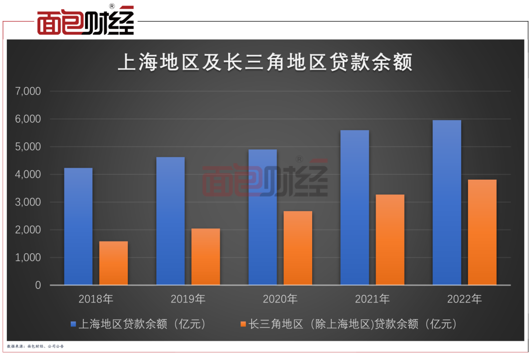 截至2022年末,上海地区贷款余额为5956.23亿元,较上年末增加354.61亿元,增幅为6.33%;长三角地区(除上海地区)贷款余额为3816.71亿元,较上年末增加539.39亿元,增幅为16.46%,占客户贷款和垫款总额的比例为29.26%,占比较上年末提升2.48个百分点。