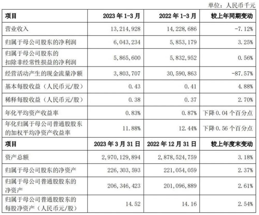 今年一季度,上海银行业绩增速同比下降,且营收同比下滑。一季报显示,今年一季度,该行归母净利润为60.43亿元,同比增3.25%。而营业收入为132.15亿元,同比降7.12%。与2022年一季度该行营收同比2.95%的增速及归母净利润5.39%的同比增速相比,今年一季度该行业绩增速放缓。