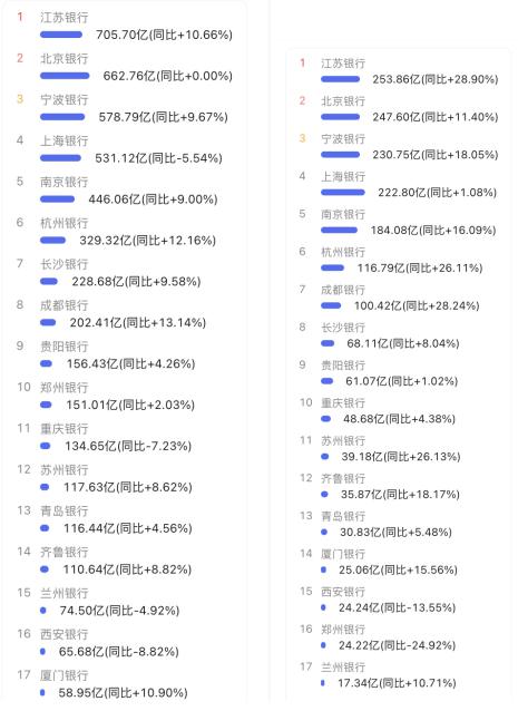 (以上两图分别为 2022 年 17 所上市城商行营收、净利润对比)