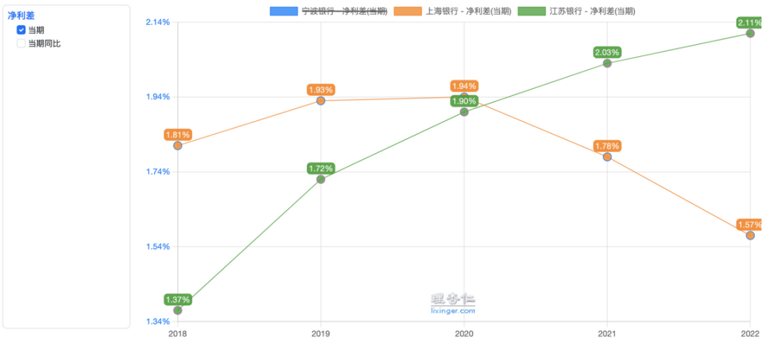 从上图来看,2020年以前,上海银行的净利差,都要高于江苏银行。2020年以后,江苏银行迅猛拉开差距。