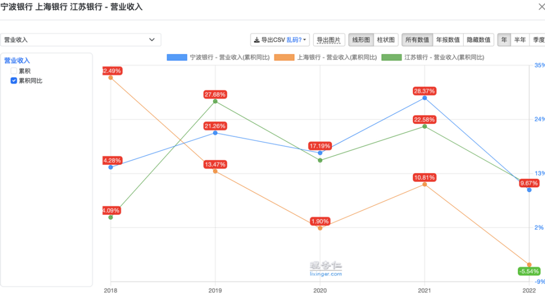 从上图可以看出,宁波银行、江苏银行的同比增速远高于上海银行。
