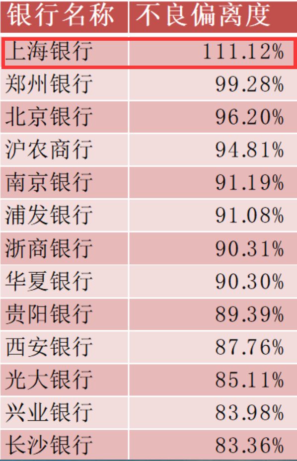 自媒体“机构派”以截至2022年上半年的数据,从不良偏移度(逾期90天以上占比/不良率)指标为排名,上海银行成为唯一一家不良偏移度超过100%的银行。