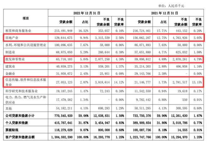 2022年度,上海银行在信息传输和软件服务业的不良贷款余额已经超越房地产,高达38亿元以上,比房地产行业的不良贷款余额还多出了5亿多,信息传输和软件服务业的不良贷款的不良率高达14.12%,是房地产行业不良率的5倍多!