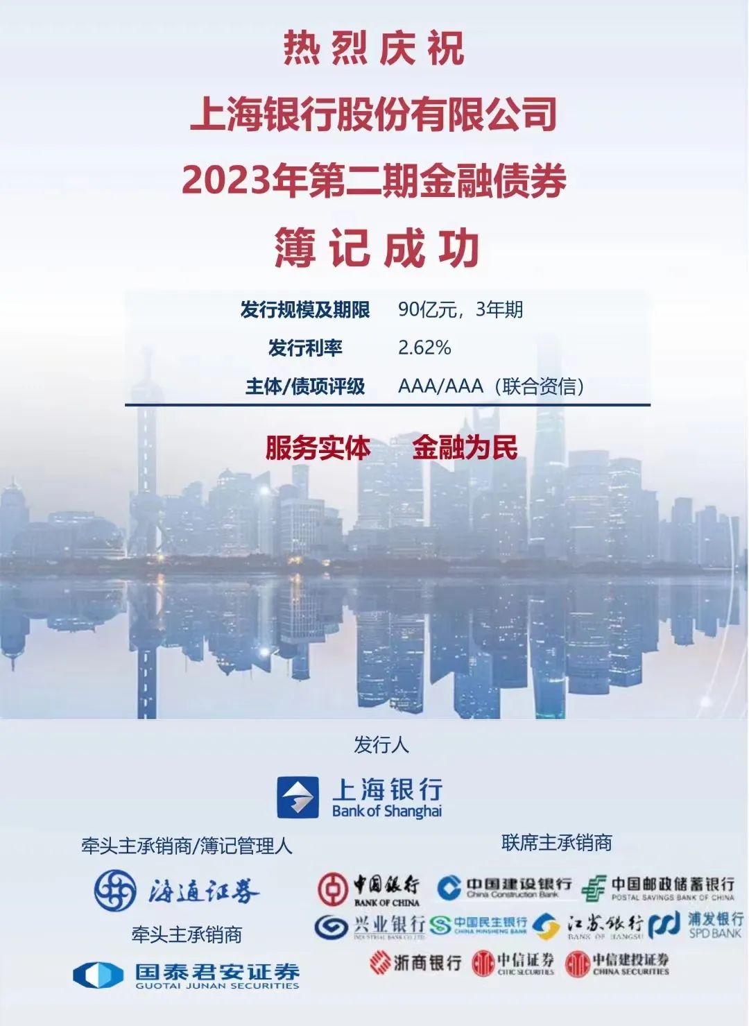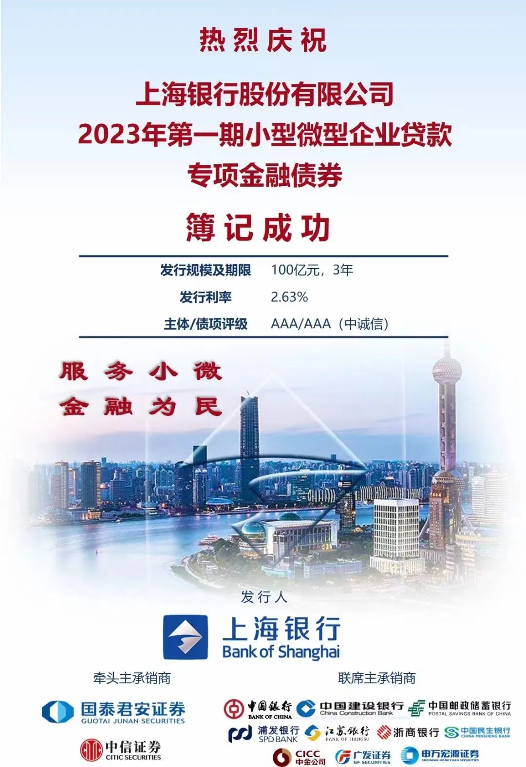近日,上海银行通过上海清算所,在全国银行间债券市场成功发行2期金融债券,共计190亿元人民币,其中小微金融债券100亿、票面利率2.63%,普通金融债券90亿、票面利率2.62%,期限均为3年期。两期债券发行吸引了市场各类型投资人参与,簿记当日市场认购踊跃,全场认购倍数均超2.5倍。