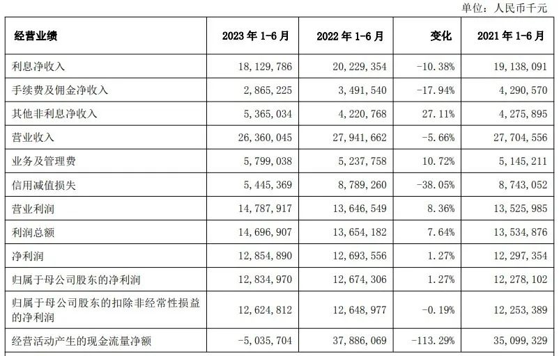 当然不管怎么精品,大背景在这里,不少银行都有压力。上海银行也不例外,2023上半年取得营收263.60亿元,2022年同期为279.41亿元,同比下滑了5.66%。
