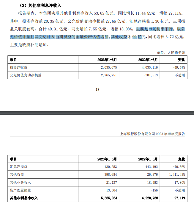 上海银行在财报中也指出:“主要是市场利率下行,以公允价值计量且其变动计入当期损益的金融资产估值增加。其他收益3.99亿元,同比增长3.72 亿元,主要是政府补助增加。”