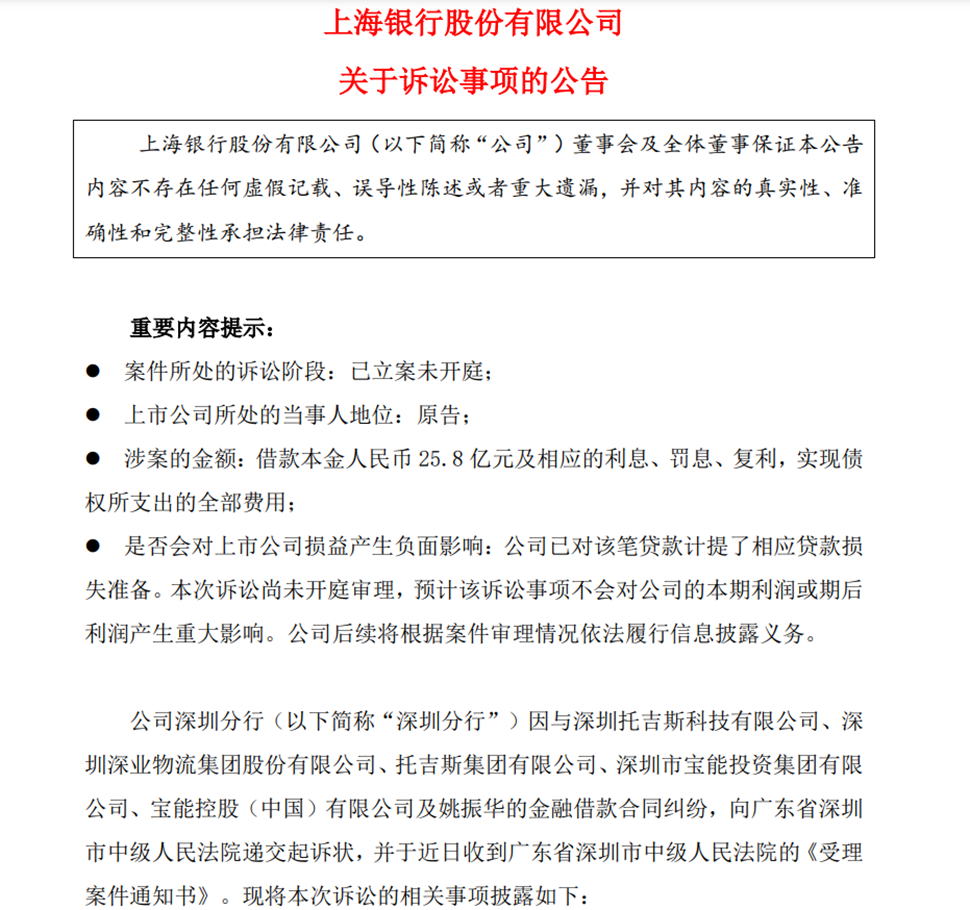 10月14日,上海银行发布一则公告称,因为金融借款合同纠纷,已向深圳托吉斯科技有限公司(下称“托吉斯科技”)、宝能控股(中国)有限公司(下称“宝能控股”)、姚振华在内的六名被告人,追讨25.8亿元的借款本金,及相应利息、罚息和复利。
