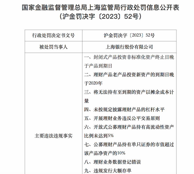 第二张罚单显示,上海银行有十三项违法违规事实,包括封闭式产品投资非标准化资产终止日晚于产品到期日、理财产品老产品投资新资产的到期日晚于2020年、将无法持有至到期的资产以摊余成本计量、未按规定披露理财产品的杠杆水平、开展理财业务违反公平交易原则、开放式公募理财产品持有高流动性资产比例未达到5%、公募理财产品持有单只证券的市值超过该产品净资产的10%、理财业务数据登记错误等,被处于责令整改,并合计罚款690万元。