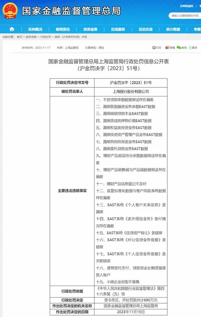 具体来看,其中一张罚单涉及EAST数据报送,比如贸易融资业务余额EAST数据、EAST系统《表外授信业务》垫付情况存在偏差等,被责令改正。并处罚款共计690万元。