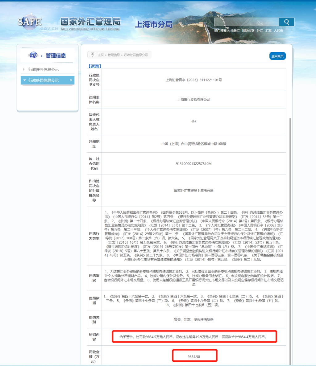 对此,国家外汇管理局上海市分局对该行给予警告,并处罚款9834.5万元人民币,没收违法所得19.9万元人民币,罚没款合计9854.4万元人民币;同时,对三名相关责任人分别给予警告及罚款。从处罚金额上看,这是近几年来外汇处罚案例中金额巨大的一笔。
