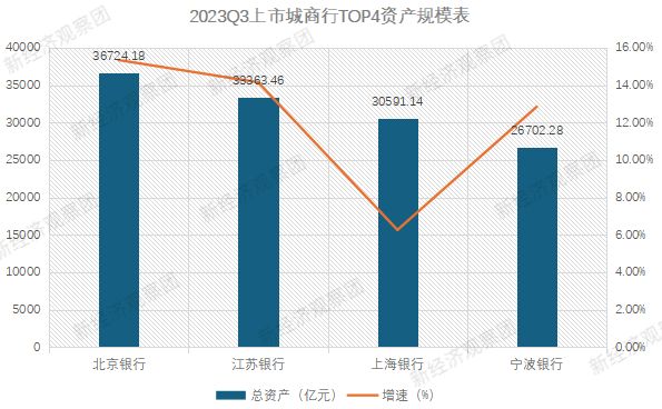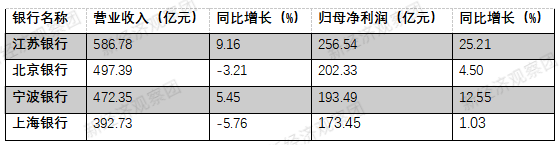 在资产规模增速方面,上述四家银行仅上海银行增速为个位数,其余三家增速均超过10%,其中北京银行资产总额同比增长15.34%;江苏银行总资产较上年末增长11.95%;宁波银行资产总额较年初增长12.85%。