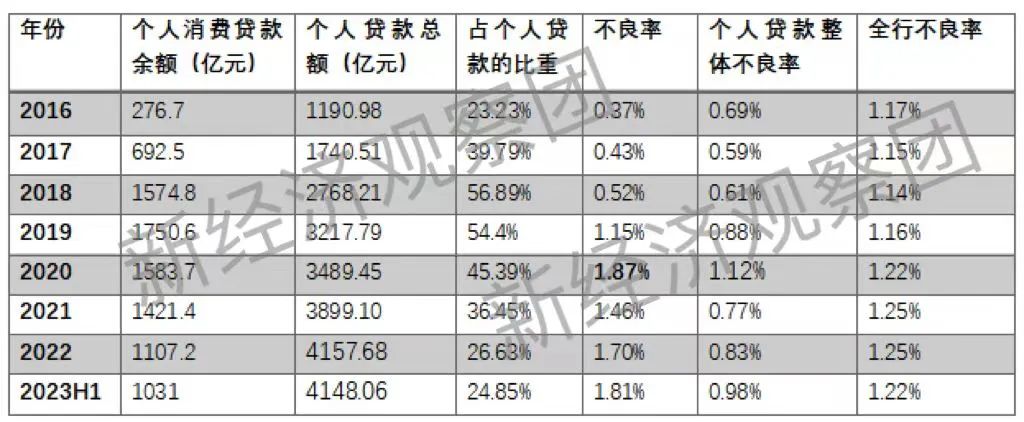 而上海银行这边,伴随政策导向压缩个人消费贷业务,2020年开始缩减该业务。2022年底,其个人消费贷余额已降至1107亿元左右,2023年上半年进一步下降到1031亿元,在个人贷款业务中的占比降至25%以下,虽然规模还在千亿之上,但占比基本上回到七年前。
