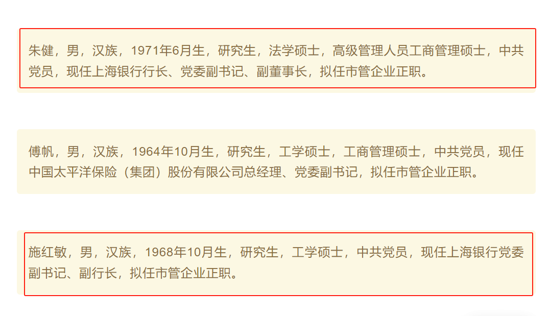 其中,上海银行行长、党委副书记、副董事长朱健,拟任市管企业正职。上海银行党委副书记、副行长施红敏也有望高升,拟任市管企业正职。