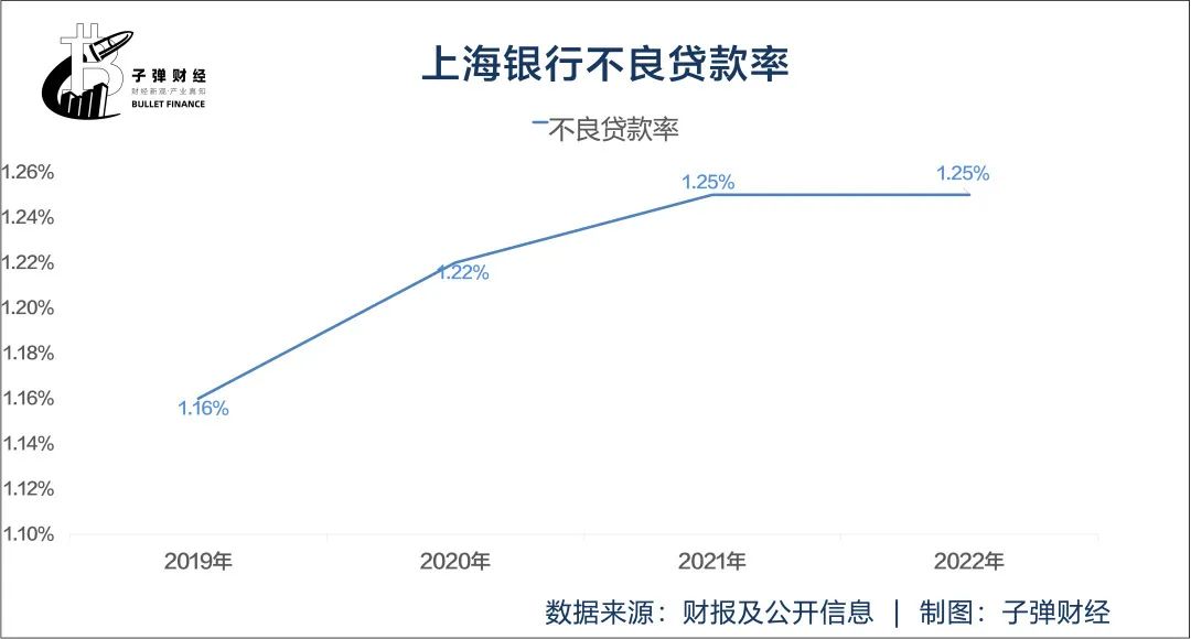 自2019年开始,上海银行的不良贷款率开始攀升。2019-2022年,不良贷款率分别为1.16%、1.22%、1.25%、1.25%。直到2023年才有下降的势头,截至9月末,上海银行不良贷款率为1.21%,较2022年末减少0.04个百分点。