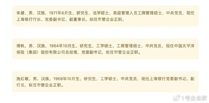 11月24日,微信公众号“上海发布”发布的《上海市市管干部任职前公示》显示,现任上海银行行长、党委副书记、副董事长朱健以及现任上海银行党委副书记、副行长施红敏,均拟任市管企业正职。