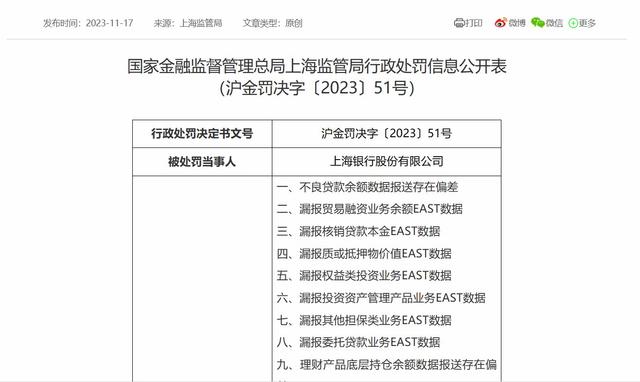 除了EAST数据报送出现上述19项违法违规事实外,另一张罚单则直指上海银行理财业务。