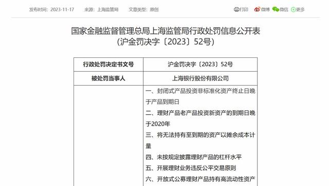 沪金罚决字〔2023〕52号罚单显示,上海银行因未按规定披露理财产品的杠杆水平、开放式公募理财产品持有高流动性资产比例未达到5%、公募理财产品持有单只证券的市值超过该产品净资产的10%,以及违规发行大额存单等13项违法违规事实,于11月15日被上海监管局责令改正,并处罚款共计690万元。