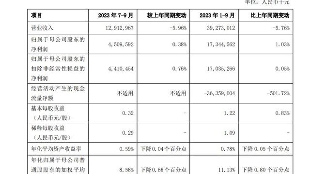 据最近发布的2023年三季度报告显示,该行业绩增长乏力的问题依旧存在。截至9月底,该行前三季度实现营业收入392.73亿元,同比下滑5.76%;归母净利润173.45亿元,同比微增1.03%。