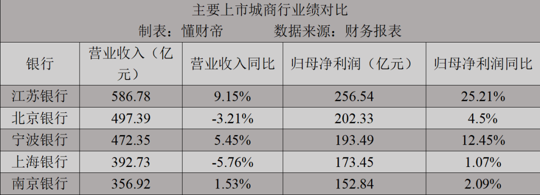 其同比6.14%的营收增速,在17家上市城商行中排名第13,盈利能力也落后于江苏银行、北京银行等头部城商行。