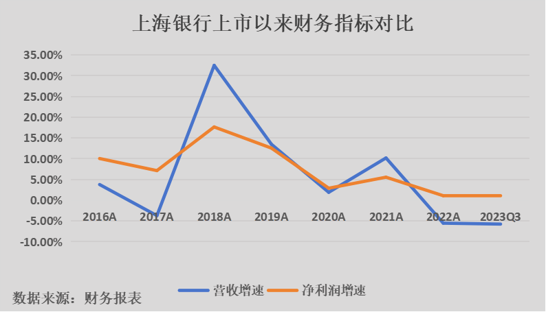 在17家上市城商行中,上海银行的营收增速排名倒数第2,归母净利润增速排名倒数第4位。