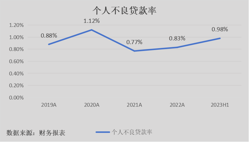 如今,消费贷规模虽已回落,但留有明显的“后遗症”,其带来的不良贷款率是该行的痛点。截至今年上半年,该行的个人不良贷款率为0.98%,处于上升趋势。