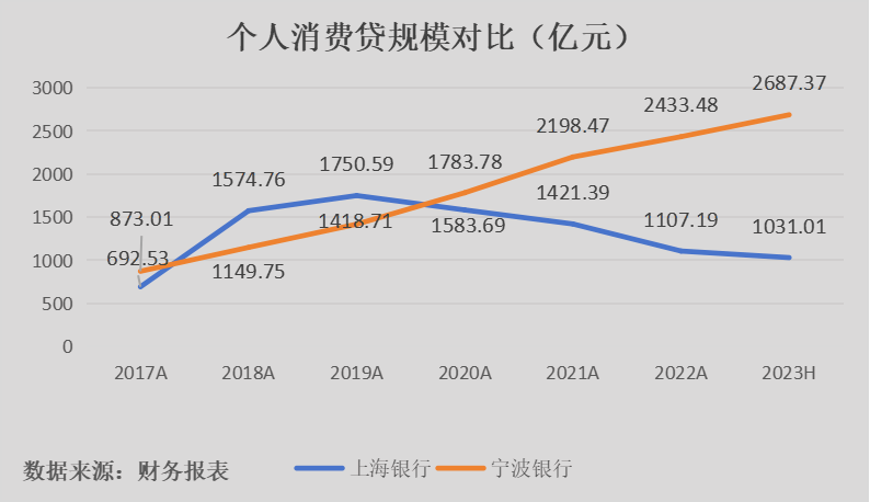 数据显示,2016年其消费贷规模还不到300亿,同期宁波银行的规模已达864亿元。2018年上海银行就暴涨至1574.76亿,同比增长127.39%。宁波银行则为1149.76亿,同比增长31.70%,扩充速度差异悬殊。