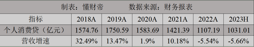 同时,主动收缩消费贷成为了该行业绩失速的重要原因,其时间线与营收增速大致成正相关。