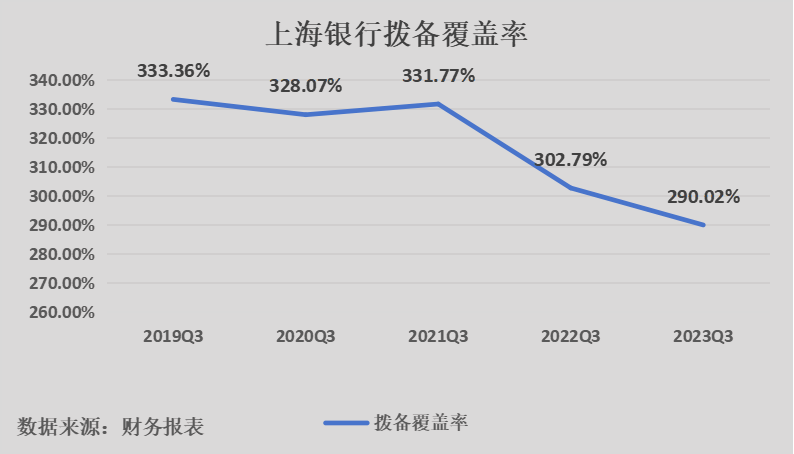 作为一项能够反映风险抵御能力的指标,拨备覆盖率向来备受资本市场和投资者的关注。2023年Q3,上海银行的拨备覆盖率为290.02%。虽然远高于监管要求的150%,却是近年来的最低水平,比去年同期下降了10.77%,在上市城商行中排名第10。