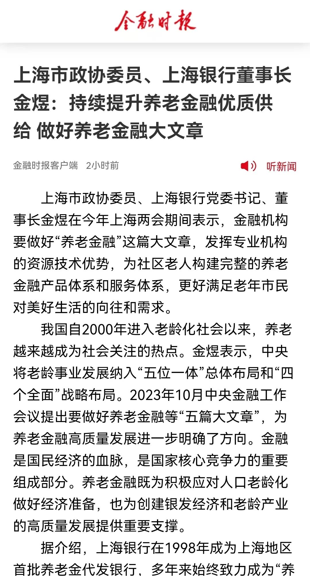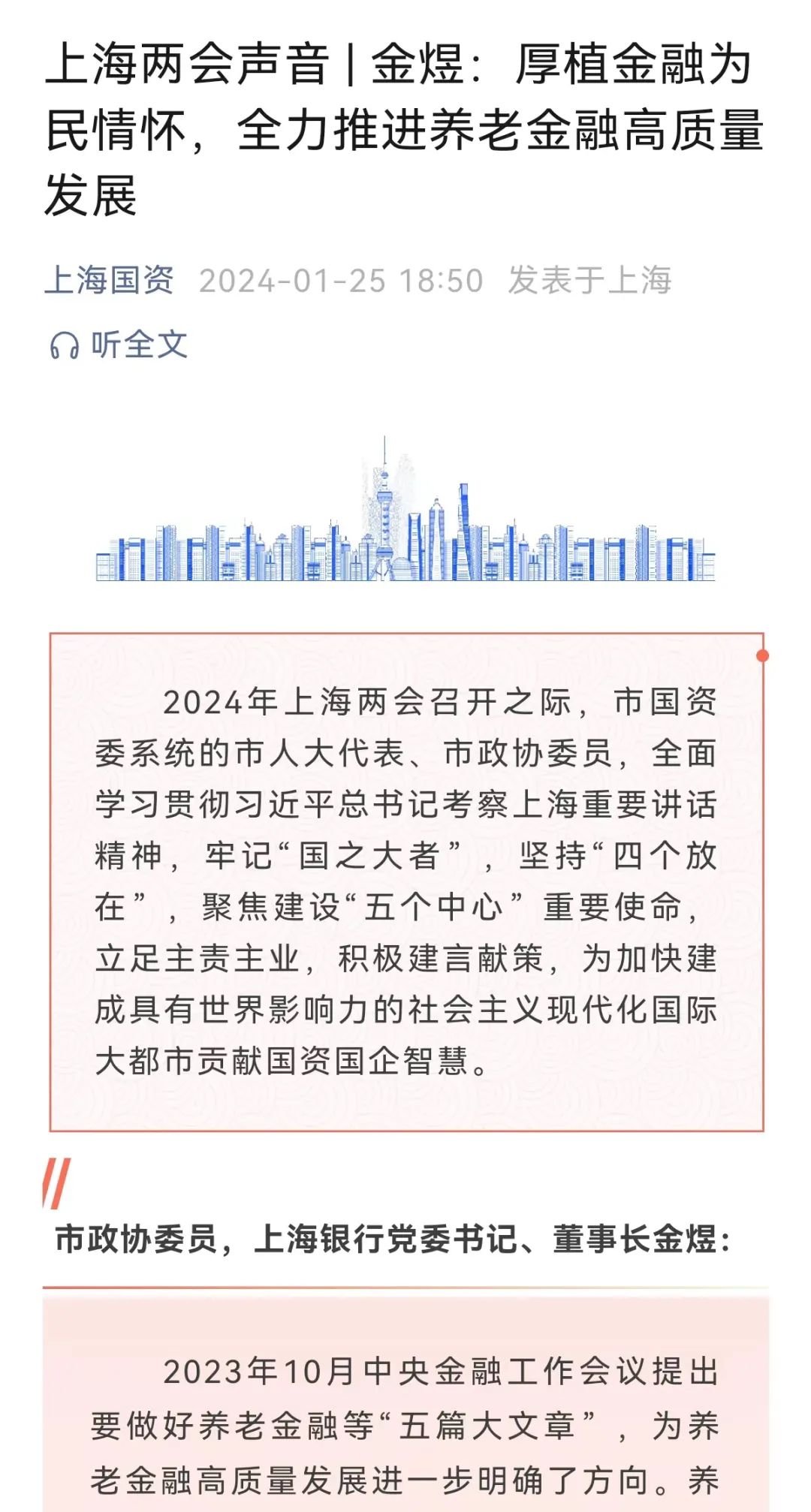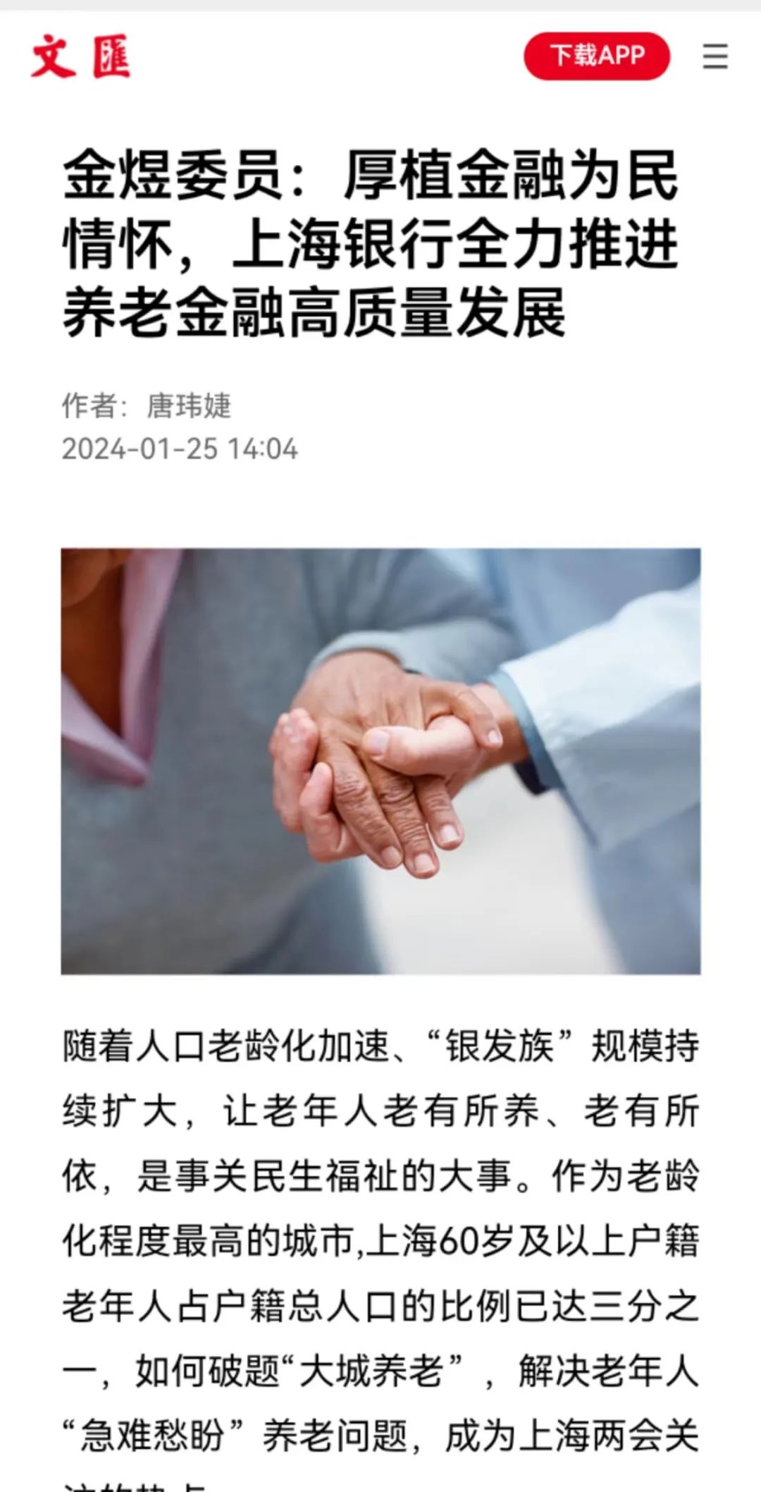 “大城养老”是当前上海两会高度关注的话题。1月25日,上海市政协委员,上海银行党委书记、董事长金煜关于养老金融高质量发展的观点被解放日报、文汇报、金融时报、市国资委官微等援引报道。