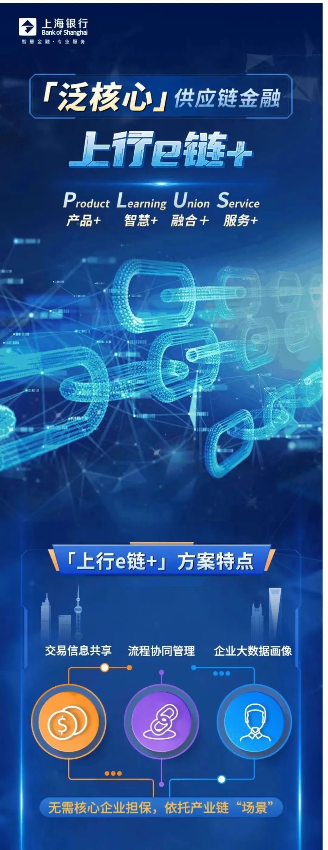 近年来,上海银行依托供应链金融服务优势,持续打造“上行e链+”泛核心供应链服务体系,已陆续推出“e采购”“e订单”“e保理”“e库存”“e商票“等标准化泛核心产品,依托交易场景下“数据流、资金流、物流”信息获取与核心企业协同管理能力,为企业提供线上供应链管理、支付结算、融资受理等综合金融服务。依托数字化风控手段以及线上化便利渠道,不断缩短中小企业融资周期,解决供应链上下游企业的资金难题,有效降低中小企业的融资成本,持续扩大产业链服务覆盖面。