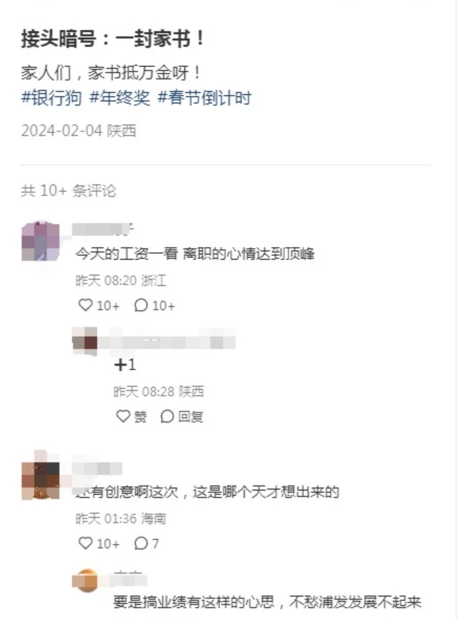 有浦发员工吐槽,“两天无法平静,百日攻坚连三月,一封家书抵万金。”还有员工表示,“终于体会到家书抵万金的沉重感,这份家书对不起日夜加班,工作占据大部分时间,生活都靠家属来扛的一线员工”
