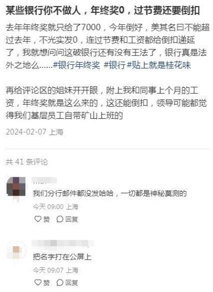 今日,有网友爆料称,上海银行去年年终奖只发7000元,今年不但实发年终奖为零,连过节费和工资都倒扣递延。“不按业绩排名考核,随领导心情给你随机考核下降,就获得绩效倒扣的权益了”。