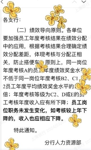 据图片显示,各支行:绩效导向原则。各单位要加强员工年度考核结果在绩效分配中的应用,根据考核结果合理确定绩效分配差距,体现考核与分配正相关,防止搭便车。此外,员工岗位职务未发生变化,如考核较上年下降,收入也应相应下降。