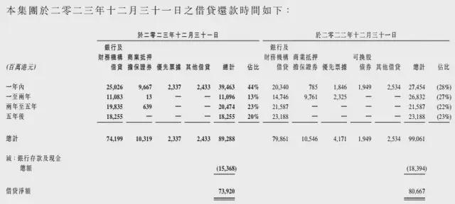 从合生创展一年内到期借贷明细看,涉及“规模最大”的银行及财务机构借贷逾250亿港元,商业抵押担保证券近97亿港元,优先票据约23.4亿港元,其他借贷24.3亿港元。
