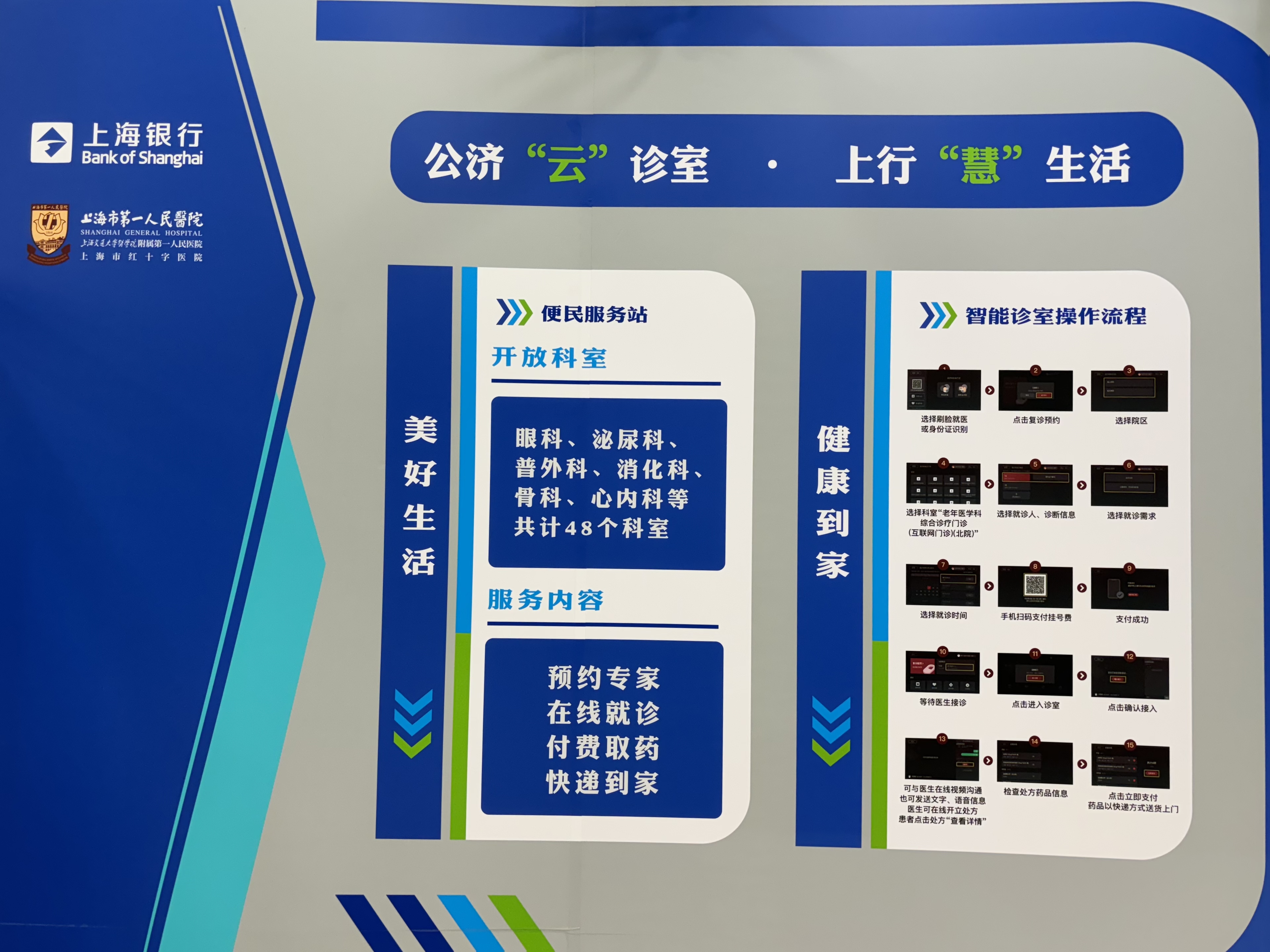 结合自身在网点服务上的贴民优势,上海银行与上海市第一人民医院一拍即合,引入互联网医院终端服务载体,再配套银行员工的辅助指导,让老年人在家门口的银行网点就可以体验到智慧医疗服务。