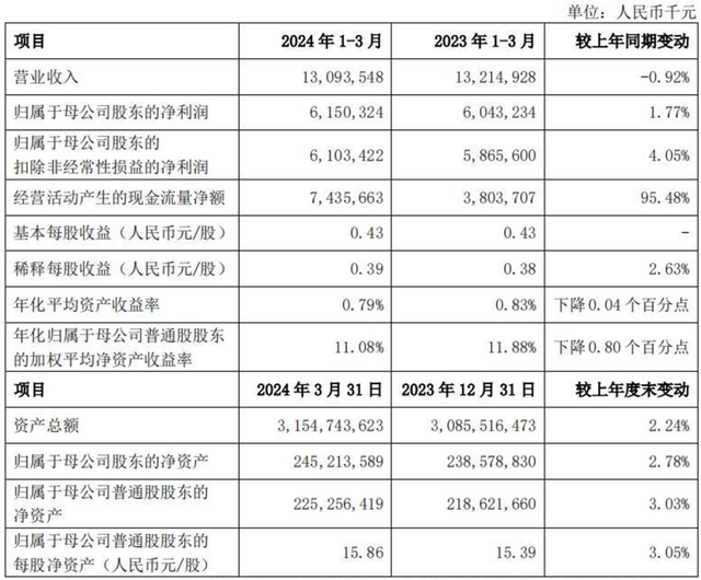 上海银行今年一季度和去年净利润虽然都呈现正增长,但增速较小。今年一季度,该行营业收入为130.94亿元,同比降0.92%;归属于母公司股东的净利润为61.5亿元,同比增长1.77%。2023年全年,该行营业收入为505.64亿元,同比降4.80%;归属于母公司股东的净利润为225.45亿元,同比增1.19%,该增速低于同期商业银行3.23%的净利润同比增速。
