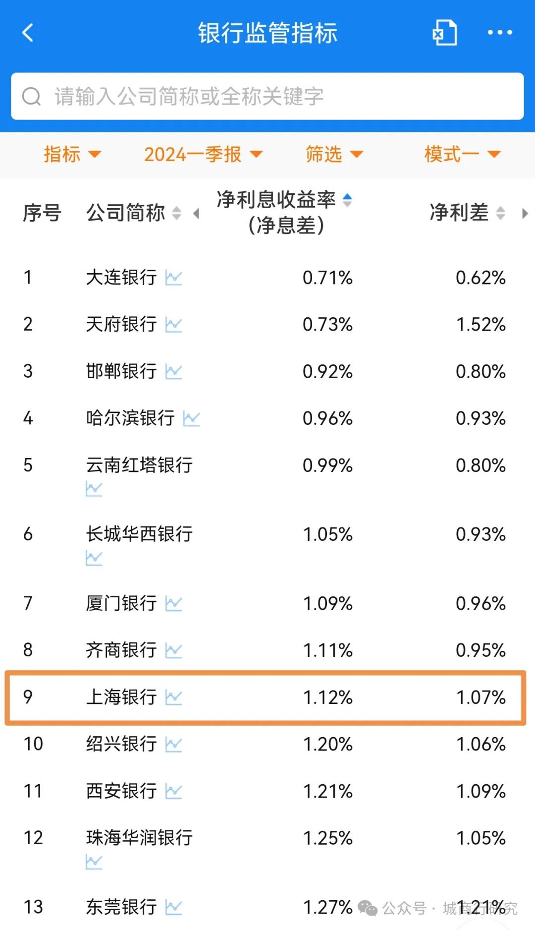2024年第一季度,上海银行净息差更是低至1.12%,在已经披露一季报的城商行排名倒数。