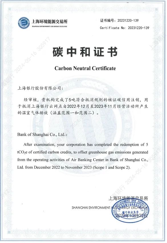 2023年,上海银行云网点服务客户267,454人次,219,327单业务。通过张江园区屋顶光伏发电及日常无纸化业务办理践行绿色办公。2023年12月,上海银行云网点获得上海环境能源交易所碳中和认证。