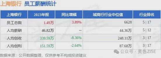 此外,数据显示,2023年上海银行人均薪酬为46.82万元,同比增加了接近3.9%,而“人均创收”指标则同比降低了近9%。