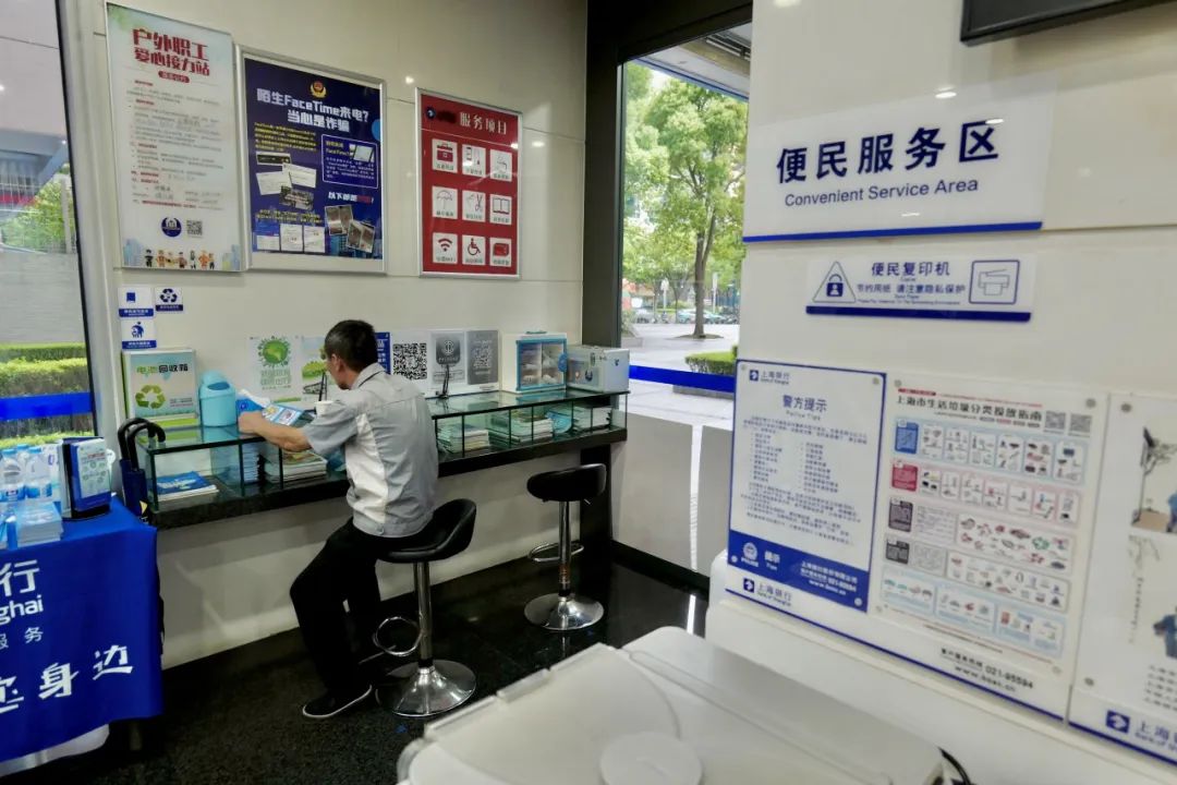 在上海银行网点可以看到,“爱心接力站”在醒目位置予以挂牌明示,方便识别。需要歇脚避暑的户外劳动者,能以最快的时间、最短的距离找到。网点小小一隅,提供了饮水休息、餐食加热、手机充电、避暑取暖等多样化的实用服务。