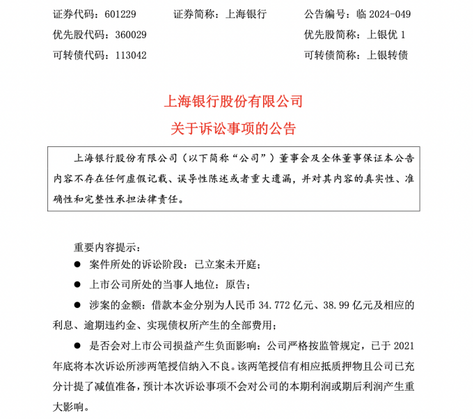 上海银行本次公告强调,已严格按监管规定,于2021年底将本次诉讼所涉两笔授信纳入不良。该两笔授信有相应抵质押物且公司已充分计提了减值准备,预计该诉讼事项不会对公司的本期利润或期后利润产生重大影响。
